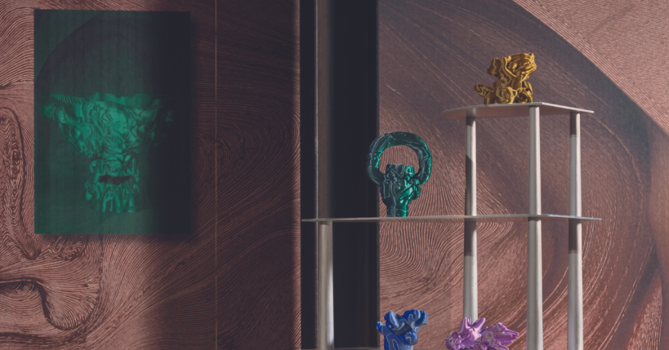 Les objets sont très physiques, ils changent constamment de forme et de couleur quand on déambule parmi eux. Leur silhouette fantaisiste et leurs couleurs chatoyantes, comme le violet et le bleu azur, accrochent le regard. Cet effet soulève des questions. Pourquoi cet objet a-t-il l’air si numérique ? De quoi est-il fait ? Combien peut-il bien peser ?