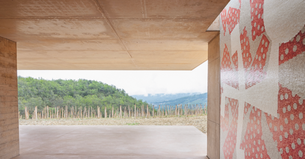 À la fois élégant et fonctionnel, le chai respecte l’ensemble du processus de vinification, car il est un outil de production. Cet achèvement fut l’occasion d’installer les premières œuvres d’art dans le domaine, celles d’Yves Zurstrassen préfigurant la mise en place d’un programme culturel pour activer le territoire. À travers son travail, l’artiste belge questionne la monumentalité, tutoyant l’échelle de l’architecture, comme en témoigne la grande fresque en céramique rouge et blanc accrochée dans le chai.