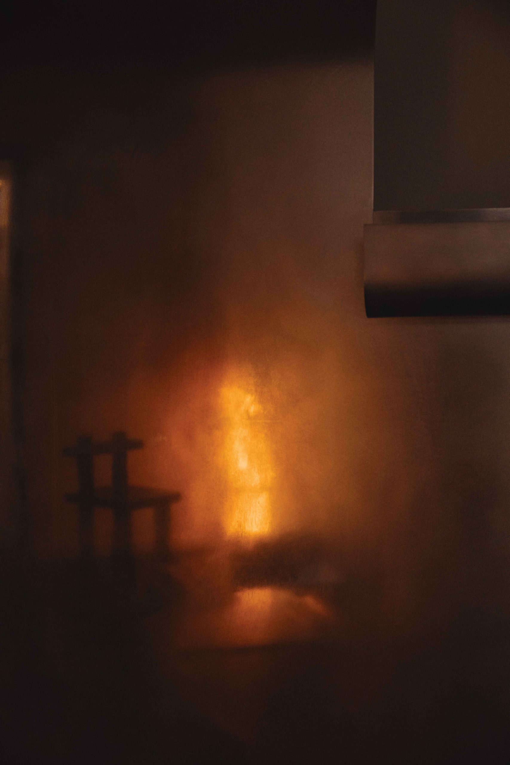 « Dès le départ, l’idée était d’utiliser cette nouvelle maison principalement comme showroom », raconte Linde Freya Tangelder. Ici, pas de canapé douillet pour admirer cette jolie vue bucolique, mais sa table de salle à manger transformée en bureau. Cette dernière trône au milieu des créations qui ont forgé la signature et la renommée internationale de la designer sous le label Destroyers/Builders, après l’obtention de son diplôme à la Design Academy d’Eindhoven en 2014. Ses célèbres tabourets laqués Windows of Bo Bardi partagent l’espace avec des lampes et des tables conçues pour Cassina. L’angle de la pièce est occupé par un Reworked Bench, ce banc en aluminium brossé présenté en avant-première au Salone del Mobile, et premier projet dans lequel elle a expérimenté le laquage des textiles. La faible lumière hivernale se reflète dans les paravents en métal et les armoires murales réfléchissantes, tandis qu’un Curved Bench attend, près de la cheminée, d’être emporté par son nouveau propriétaire.