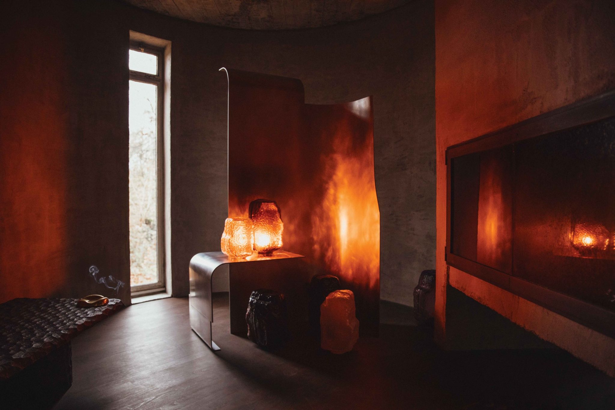 Linde Freya Tangelder a transformé l’ancien coin télé encombré en une toile de fond sereine qui met pleinement en valeur la diversité de ses créations : des pièces plus anciennes comme le lit de jour Archetyping de 2018, sculpté dans de l’aggloméré, jusqu’à des pièces en verre plus récentes.