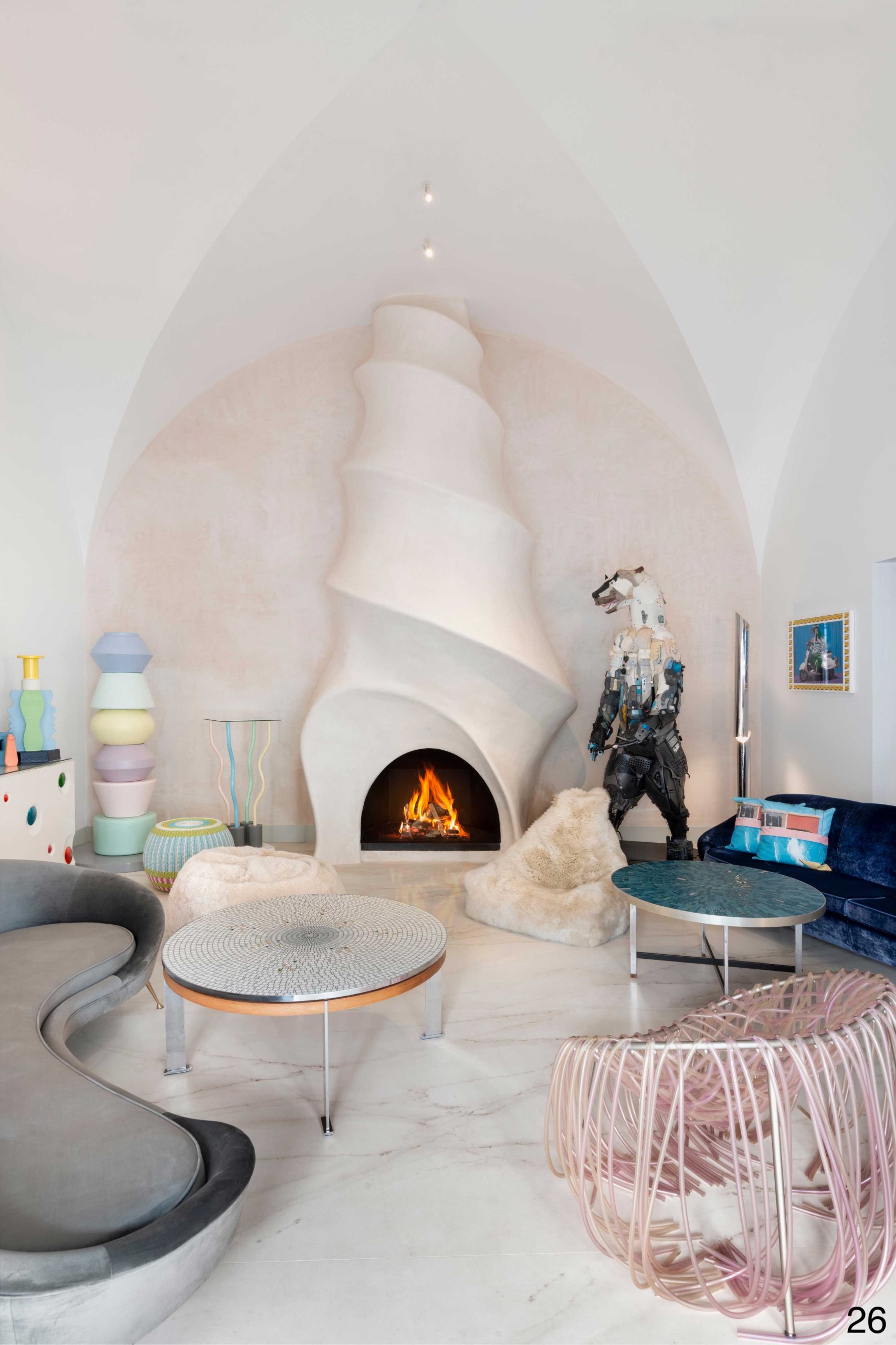 À l’intérieur, les salons en enfilade racontent une autre histoire : une cheminée monumentale réchauffe un espace orné d’œuvres animalières réalisées à partir de matériaux recyclés, la bibliothèque abrite une sélection éclectique où voisinent beaux livres et curiosités, un ascenseur tapissé de malles Vuitton vintage mène aux étages. Rien de figé, tout est détourné, assemblé, réinventé. Notre œil est happé.
