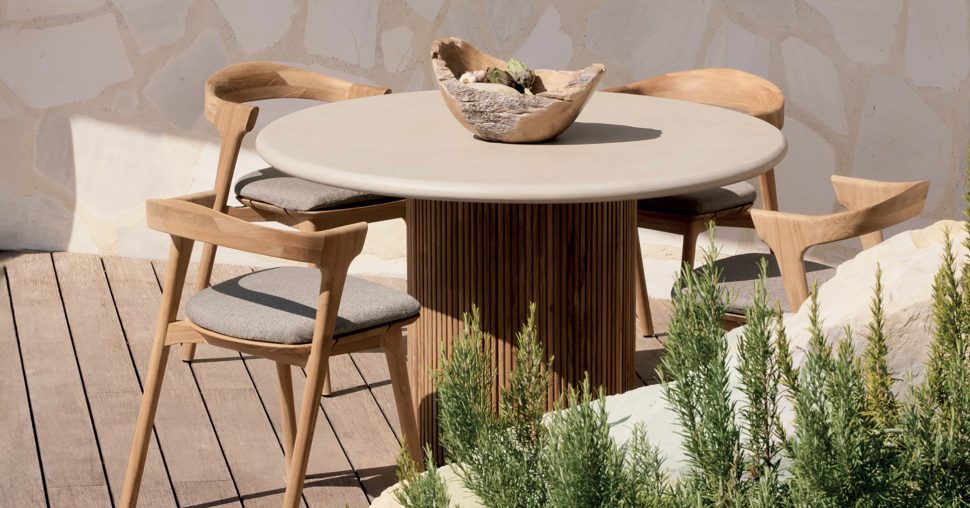 Image à la une: Table à manger Roller Max par Ethnicraft, en teck recyclé et en béton à l’épreuve des intempéries, et chaise en teck, ayant d’abord existé comme meubles d’intérieur.