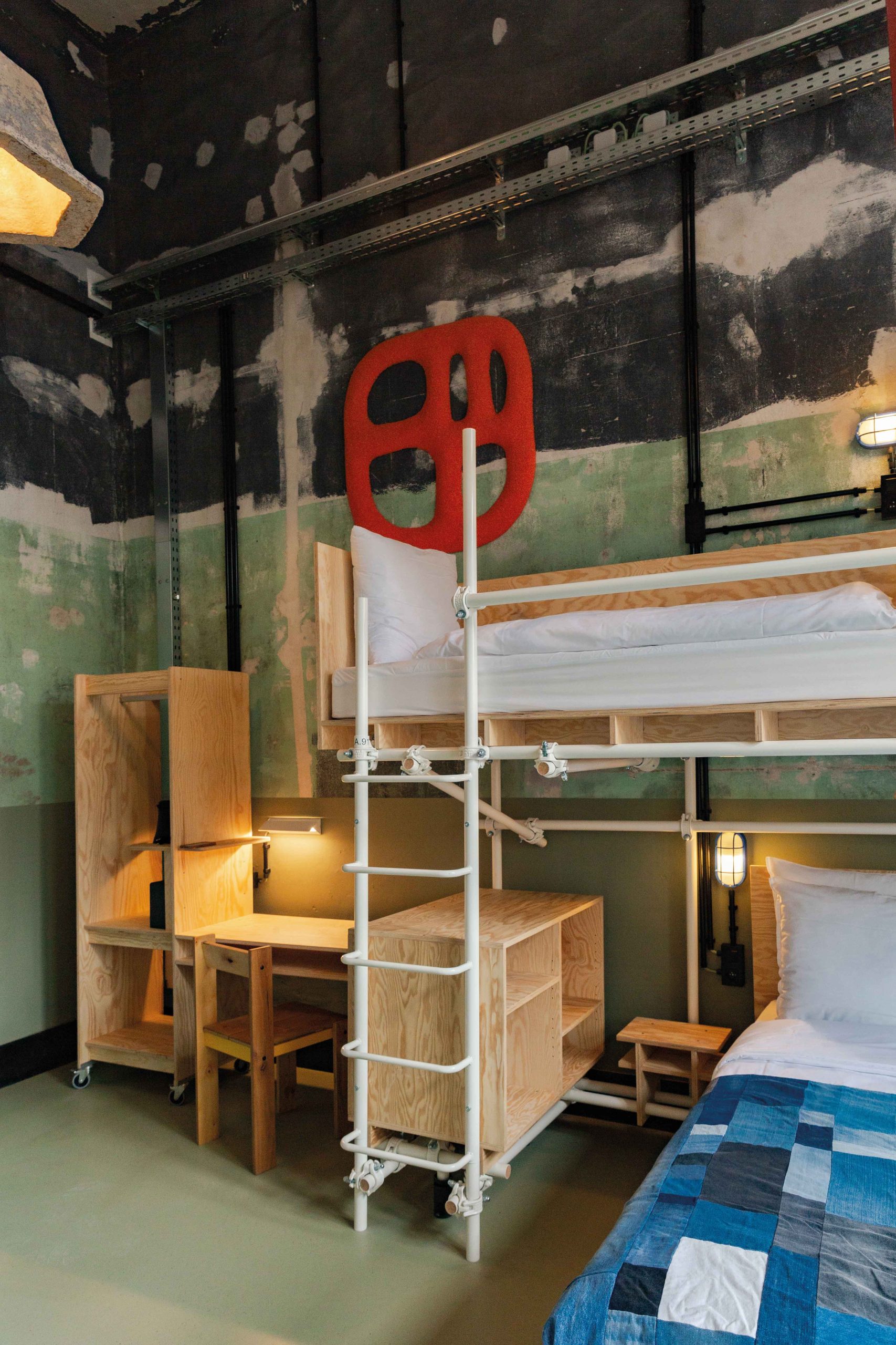 Lionel Jadot was al vanaf het eerste Jam Hotel van de partij en ook nu weer heeft hij voor een project getekend dat hem op het lijf geschreven is. Zijn concept Realistic Circle rust op vier pijlers: ecologische duurzaamheid via hergebruik, samenwerking met lokale makers en ontwerpers, sterke storytelling en de creatie van een unieke collectie gesigneerde stukken. Het interieur ademt een esthetiek van ruwe eerlijkheid: onafgewerkte muren en plafonds, gerecupereerde trappen en balies, steigerconstructies als bedden en meubels vervaardigd uit hergebruikte schoolstoelen. ‘Het voelt alsof kunstenaars het gebouw hebben ingepalmd: een grote gedeelde werkplaats vol prototypes, kunstwerken en experimenten … Niets komt hier uit een catalogus.’
