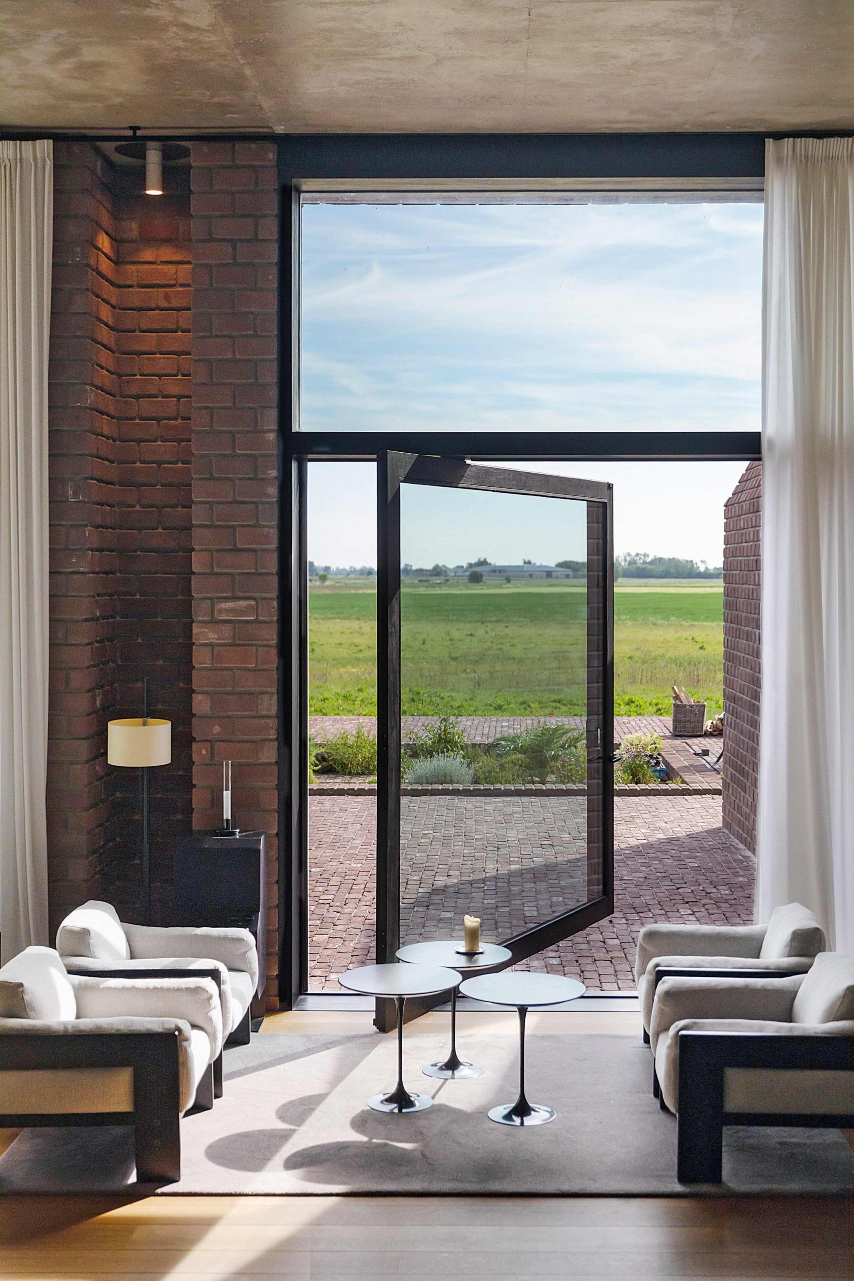 Deze ochtend maken we een omweggetje en rijden we het binnenland in. Achter een bosrand verschijnt plots het silhouet van een bakstenen bunker. Spectaculair om te zien, maar in werkelijkheid is het een villa die in de jaren 70 van de vorige eeuw door de Belgische architect Jacques Moeschal is ontworpen voor een welgestelde particulier. Chef-kok Willem Hiele viel meteen voor de radicale architectuur. Toen de woning leegstond, kreeg hij de kans om ze te kopen en dat liet hij zich geen twee keer zeggen. Toegegeven, het was een drastische wending voor iemand die tot dan toe kookte in een voormalig vissershuisje in Koksijde. Zijn karakter, tomeloze energie en instinctieve kookstijl zijn intussen onveranderd gebleven. Nog steeds bereidt hij reusachtige tarbot van vijf kilo op de barbecue en serveert hij eigenhandig wafeltjes met bruine suiker als afsluiter. ‘De strakke lijnen, de ruwe materialen en het uitzicht over de velden zijn een bron van inspiratie en brengen me dichter bij de essentie’, vertelt hij. Binnen werd de villa grondig heringericht, zodat er nu ook zes kamers zijn. Toch waart de geest van de vroegere kunst- en designverzamelaar er nog rond: in de vintagemeubels, de kunstwerken aan de muren en de sfeer die naadloos aansluit bij de warme persoonlijkheid van de chef.