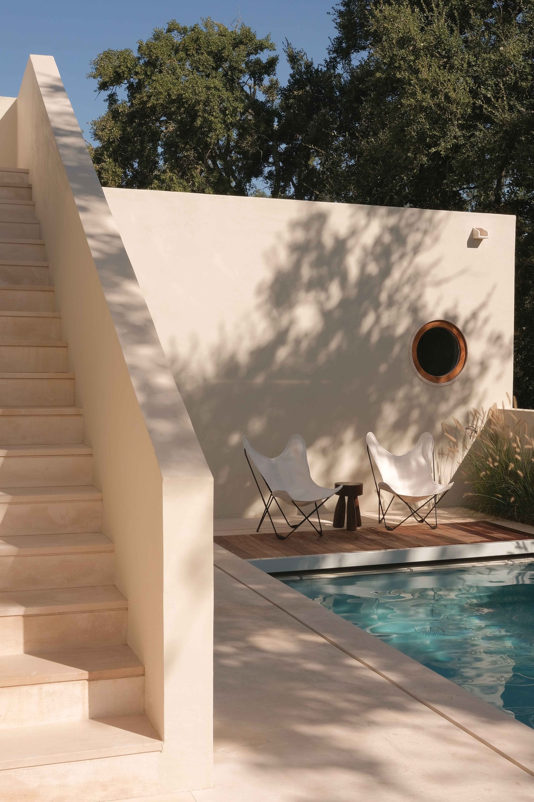 Het project in Sesimbra kreeg de naam Casa Arrábida en werd opgeleverd in mei 2024. ‘De opdrachtgever wilde een kalme plek, een huis dat rust uitstraalt en waarin je de omgeving voelt. We kozen voor lokale kalksteen die van binnen naar buiten doorloopt, wat het geheel een natuurlijke flow geeft. Elke slaapkamer kreeg een ensuite badkamer met een andere marmersoort.’ Een van de slaapkamers is verbonden met een terras dat via een buitentrap ook vanuit de tuin toegankelijk is. Andere kamers hebben patio’s of directe toegang tot de tuin, die de grens tussen interieur en landschap verder vervagen. ‘De kleuren zijn zacht, de materialen ingetogen… Maar aan elk detail werd gedacht.’ Gefascineerd door die filosofie, verhuisde Cami tijdelijk naar Lissabon. Ze ging zeven maanden aan de slag bij Pereira Miguel Arquitectos en werkte er mee aan uiteenlopende projecten. ‘Wat me opviel, is dat interieur daar geen losstaand onderdeel is. Alles wordt tegelijk overdacht – architectuur, licht, materiaal en ruimtegebruik.’