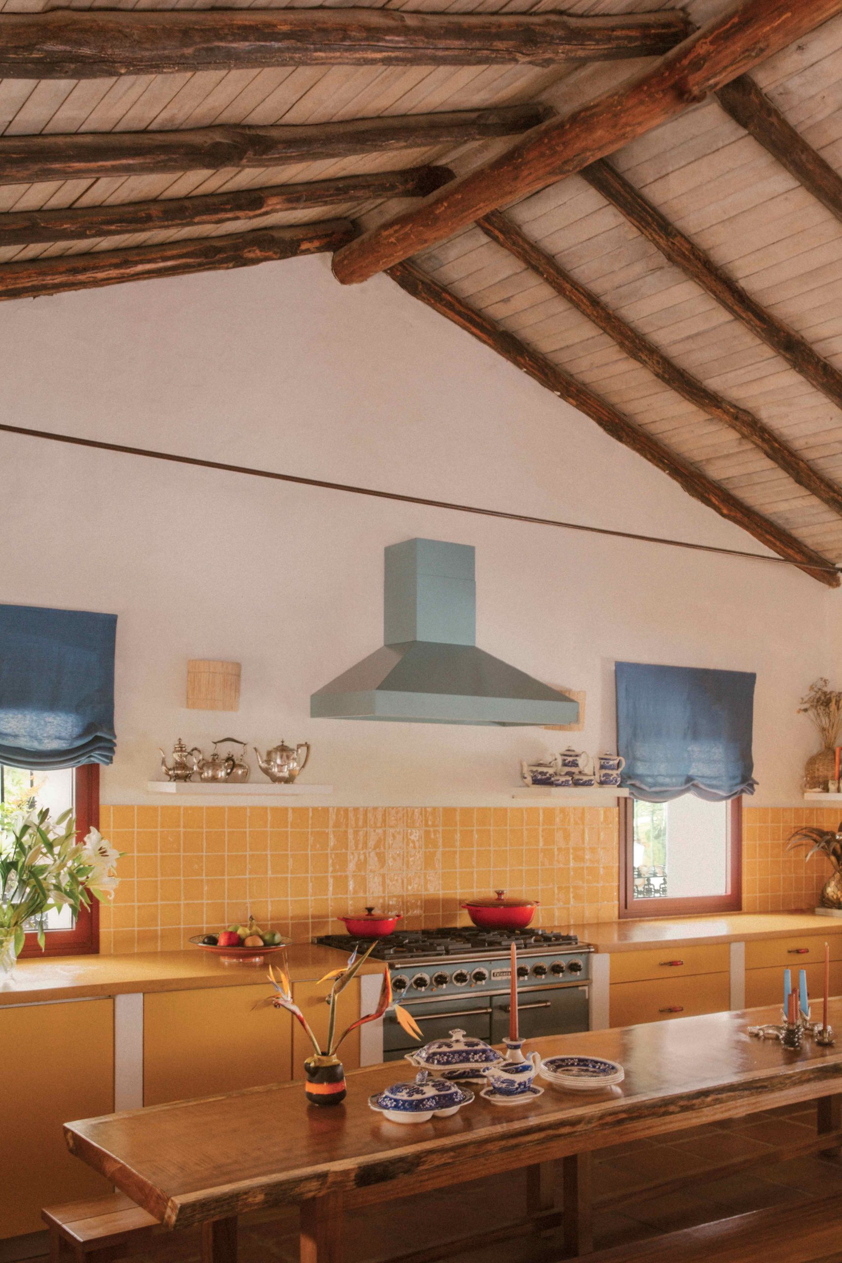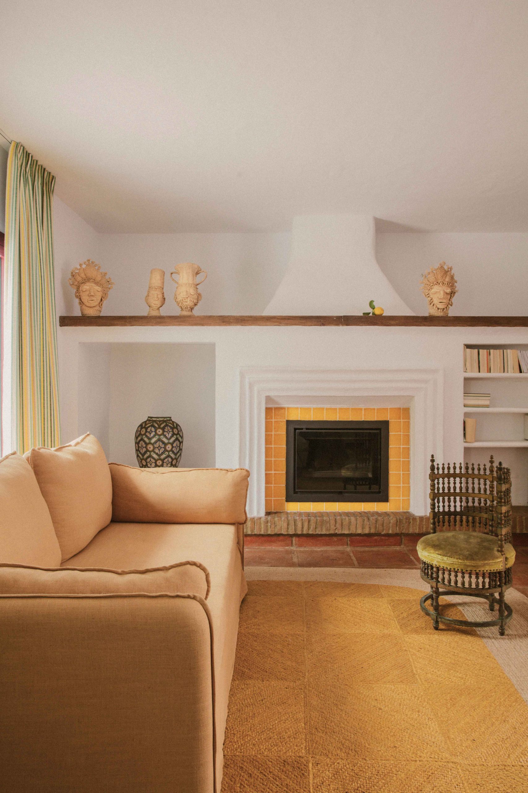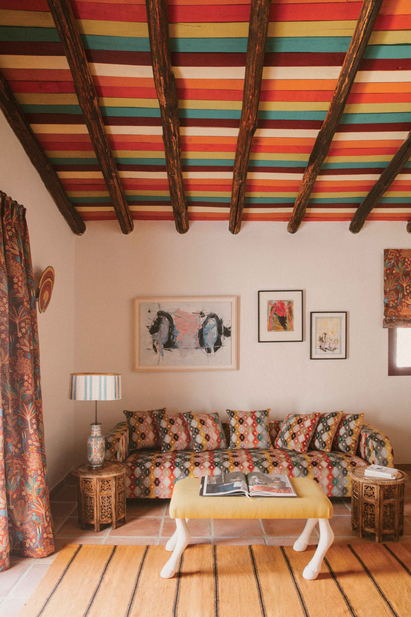 Absoluut, de woonkamer… Ik kwam op het idee om het houten plafond te schilderen in verschillende kleuren en dat heeft alles veranderd. Het geeft structuur, ritme en een sterke aanwezigheid aan de ruimte. En dan is er nog de binnenpatio. Zo eenvoudig en zo charmant. Een paar kleine tafels voor het ontbijt, parasols, een fontein. Het is het kloppende hart van het huis. Er hangt een trage, bijna meditatieve sfeer.